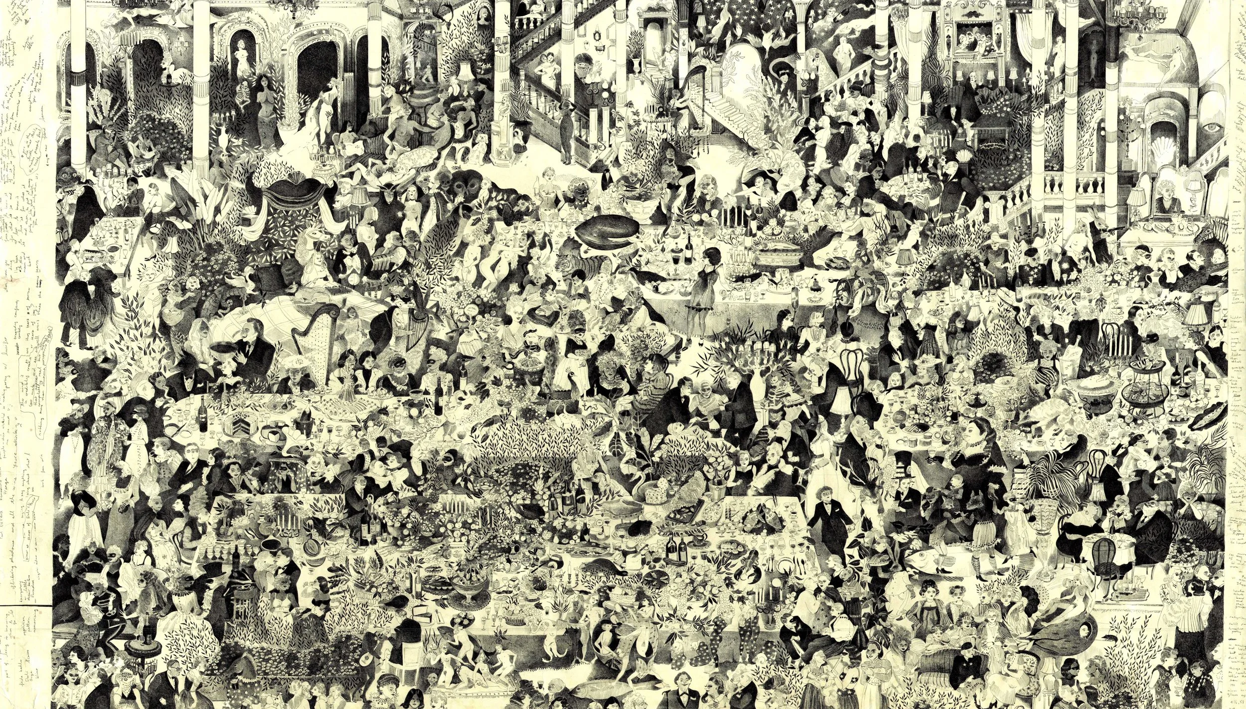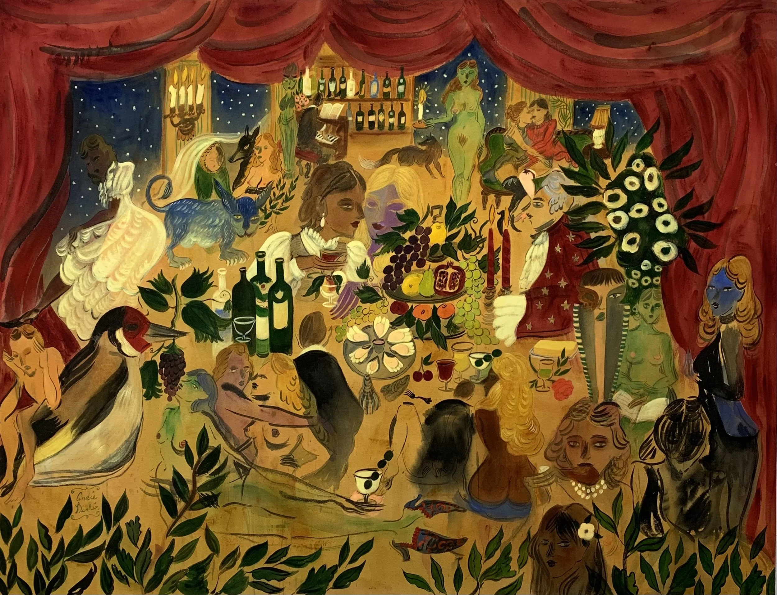 There’s something about the feeling when you first arrive at a party and you don’t know what you are about to enter into. You’re letting go of expectations of any kind of normalcy, and enjoying the feeling of not knowing where the party will take you. You’re about to enter a world where the characters may be imaginary, alter ego’s emerge, fantasy’s come alive, the food is decadent and anything is possible. This is the world LA-based artist Andie Dinkin narrates whenever she is painting and seeing the scene from afar. It’s a never-ending affair and she wants to invite you into it.