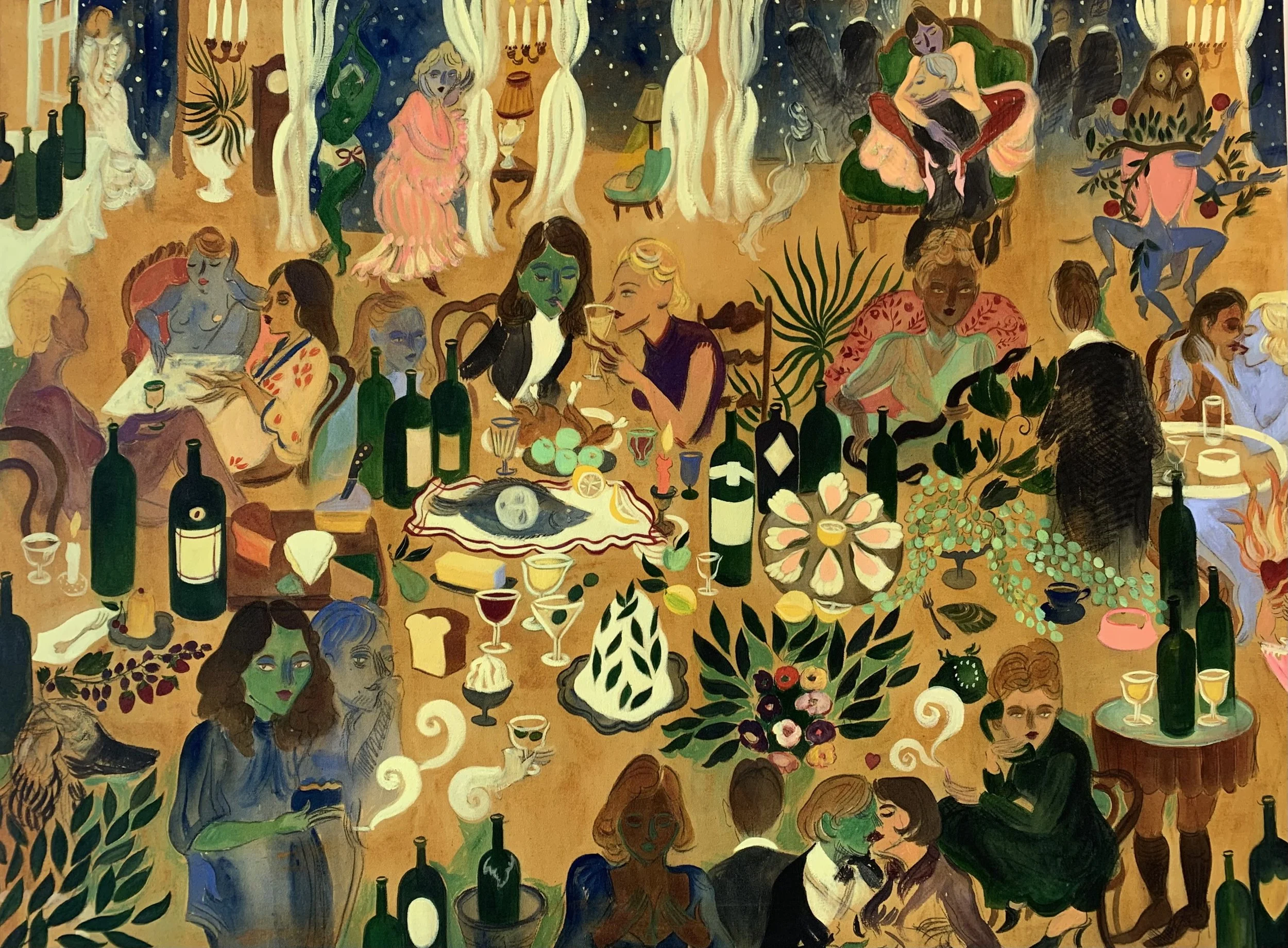 I’m still pursuing the same fundamental ideas of creating my own little world, and the imagination is everywhere. The scenes are very surreal and I want it to feel like I’m entering into these worlds that I am creating. That’s my goal for the viewer as well — to be transported into another place and time. I love long dinners and having too much wine at the table. I want the parties to feel like they are never ending. I love painting animals, women, food and pretty much any imaginary thing that I can piece together to have it somehow all make sense. I create narratives, but also want them to have a life of their own. There also needs to be enough space where I do not dictate the story so much — so they often turn into dreamscapes.